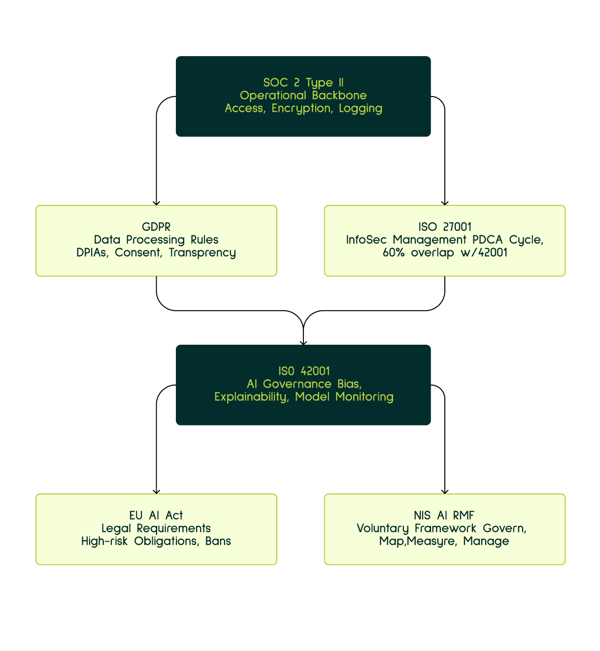 At the base, SOC 2 Type II is about proving that your day-to-day operations are secure and consistent over time. It covers access controls, encryption, logging, monitoring, and incident response and most importantly, it gives you a continuous evidence pipeline. This is the operational backbone for almost every other compliance effort. What it doesn’t cover are AI-specific risks like biases, or explainability, which is why SOC 2 alone is never sufficient for AI companies.
