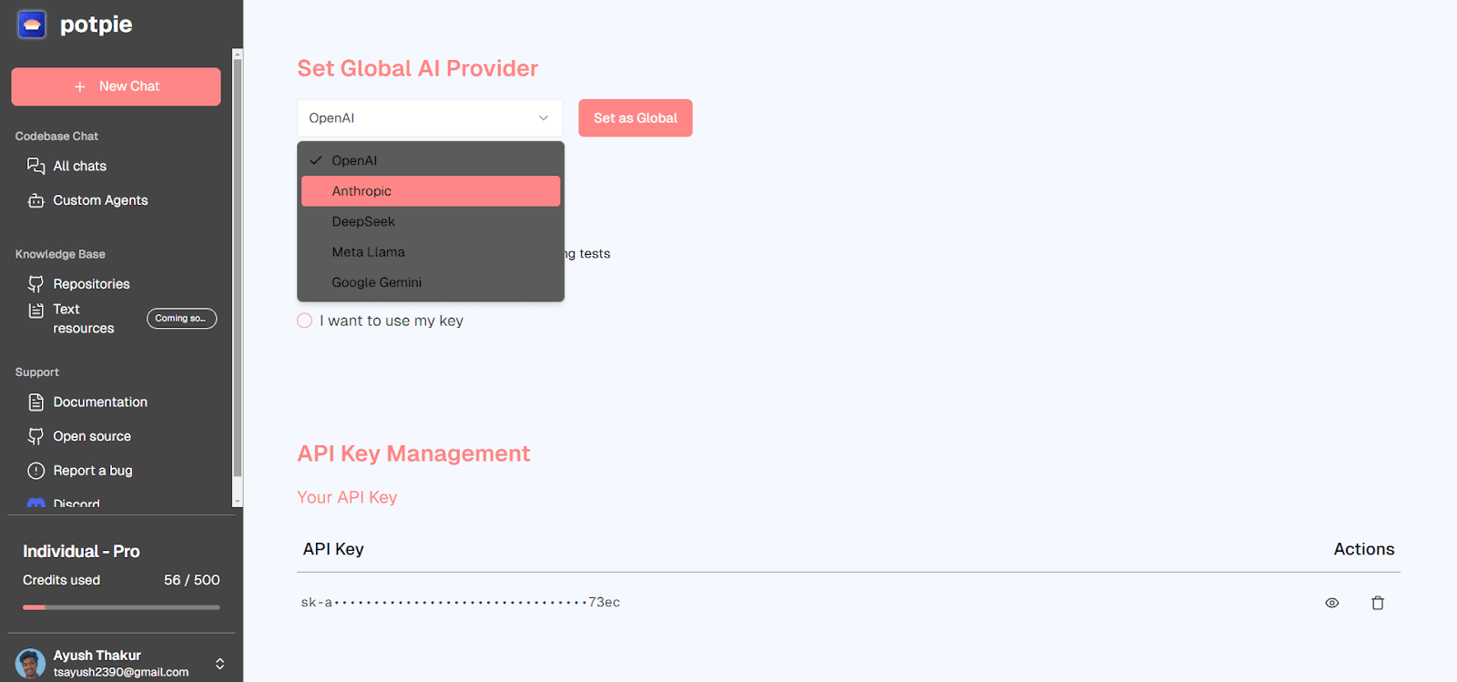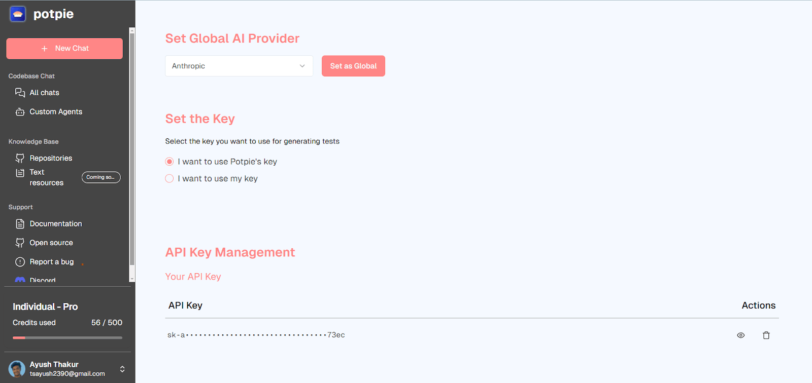 Choose Your API Key Option: Select whether you want to use your own API key or Potpie’s key. If you wish to go with your own API key, you will need to select your desired LLM and then enter your API Key.