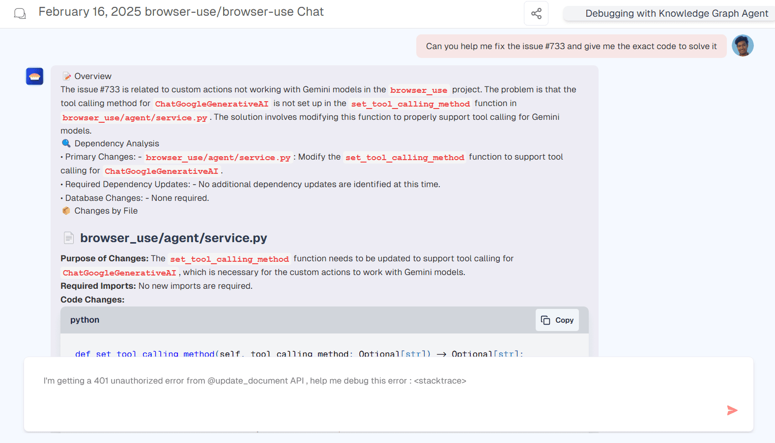 Here, we are using the Debugging with Knowledge Graph Agent to resolve an issue. We provided the agent with an issue link and instructed it to generate the exact code needed to fix the problem.